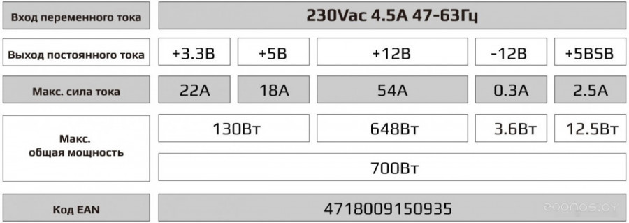 Краткое описание | Мощность: 700 Вт, Система охлаждения: 1 вентилятор, Диаметр вентилятора: 120 мм, PFC: нет, Версия ATX12V: 2.3, Тип разъема для материнской платы: 20+4 pin, Количество разъемов 4-pin CPU: 1 |