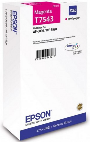 Краткое описание | Тип: чернильница, Оригинал: есть, Цвет: маджента, Ресурс: 7000 страниц, Объем: 69 мл, Совместимость с принтерами: Epson WorkForce Pro WF-8090, Epson WorkForce Pro WF-8590, Технология печати: струйный |